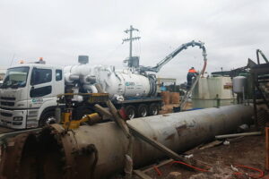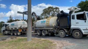 Our Intimidator combo truck and water truck work together to break up the crust on a pump station at Bethania. Our experienced technicians high pressure blasted 12,000L of water supplied from our water truck onto the crusted tank surface to soften it up into a sludge before pumping it out with the Intimidator’s high powered 6300 CFM Vacuum pump.